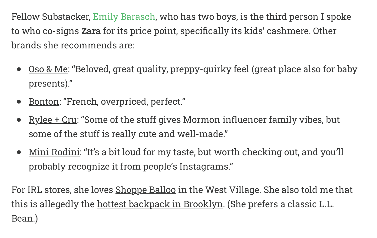 If you want more of my kids clothes recommendations, see the people’s princess Emilia Petrarca’s recent post on Shop Rat, copied and pasted here for non-paid subscribers: